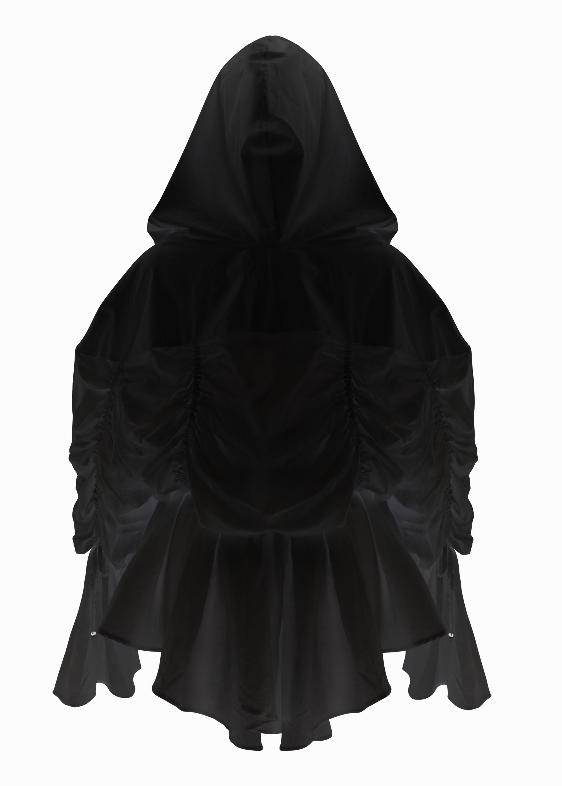 Translucent transformable jacket made of thin cotton and satin.
