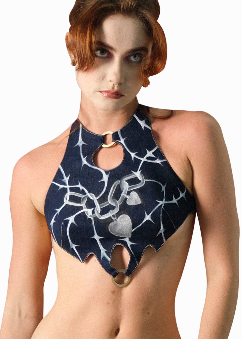 Transformable denim top with hand painting and metal rings.