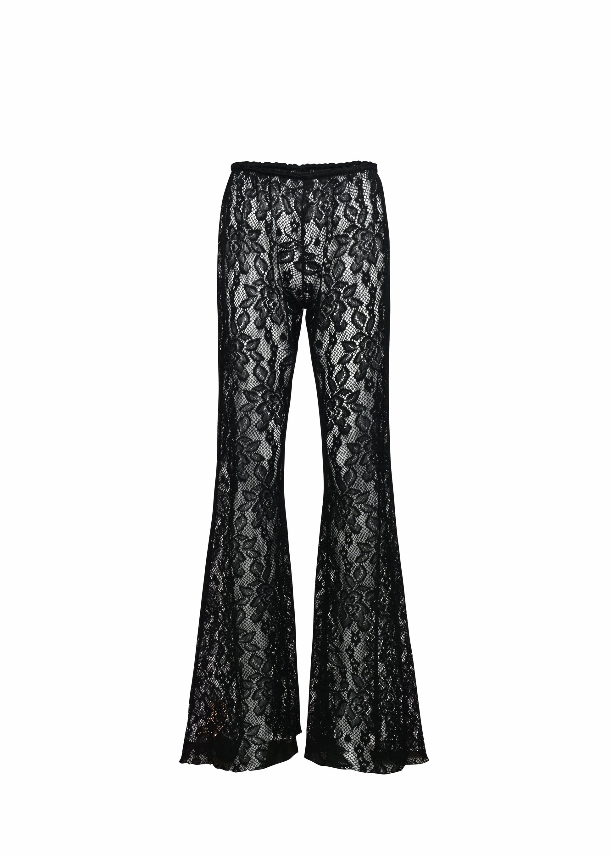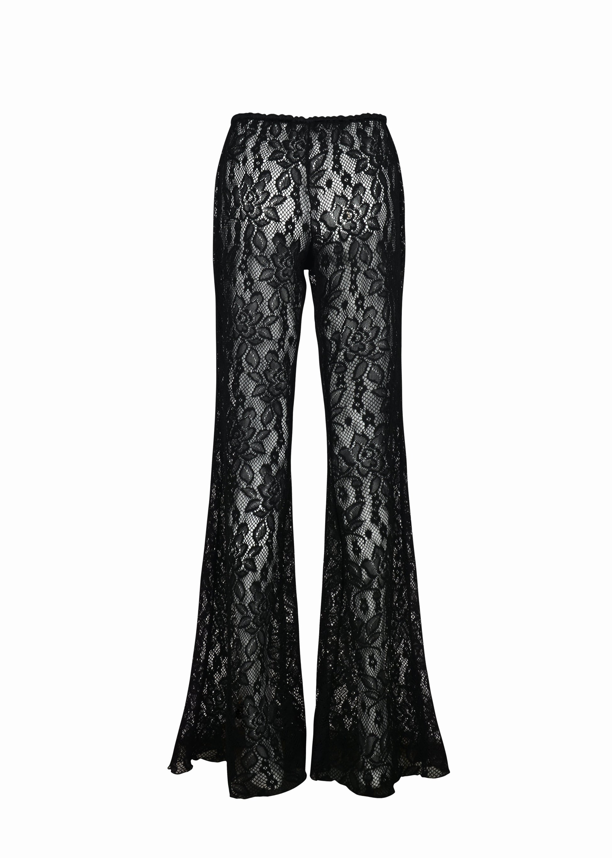 Trousers made of soft elastic lace. The product has a silk belt with an elasticated waist. Pairs perfectly with a lace top.