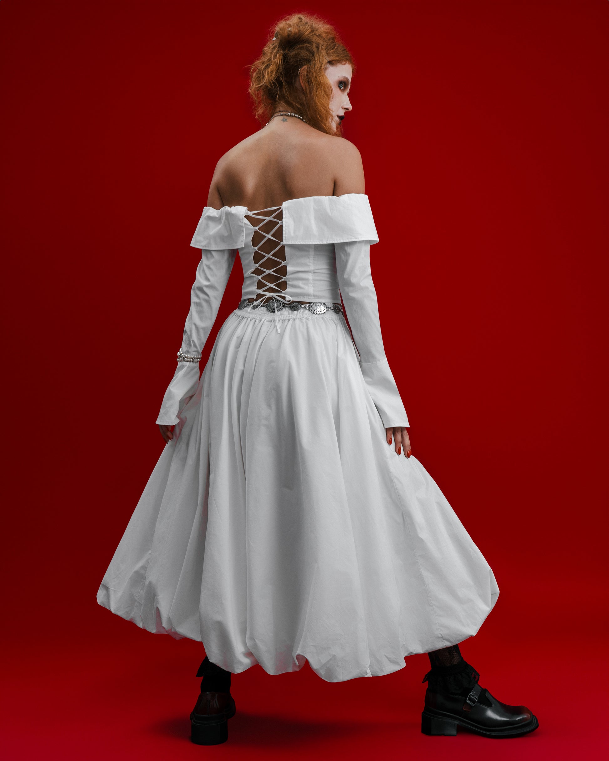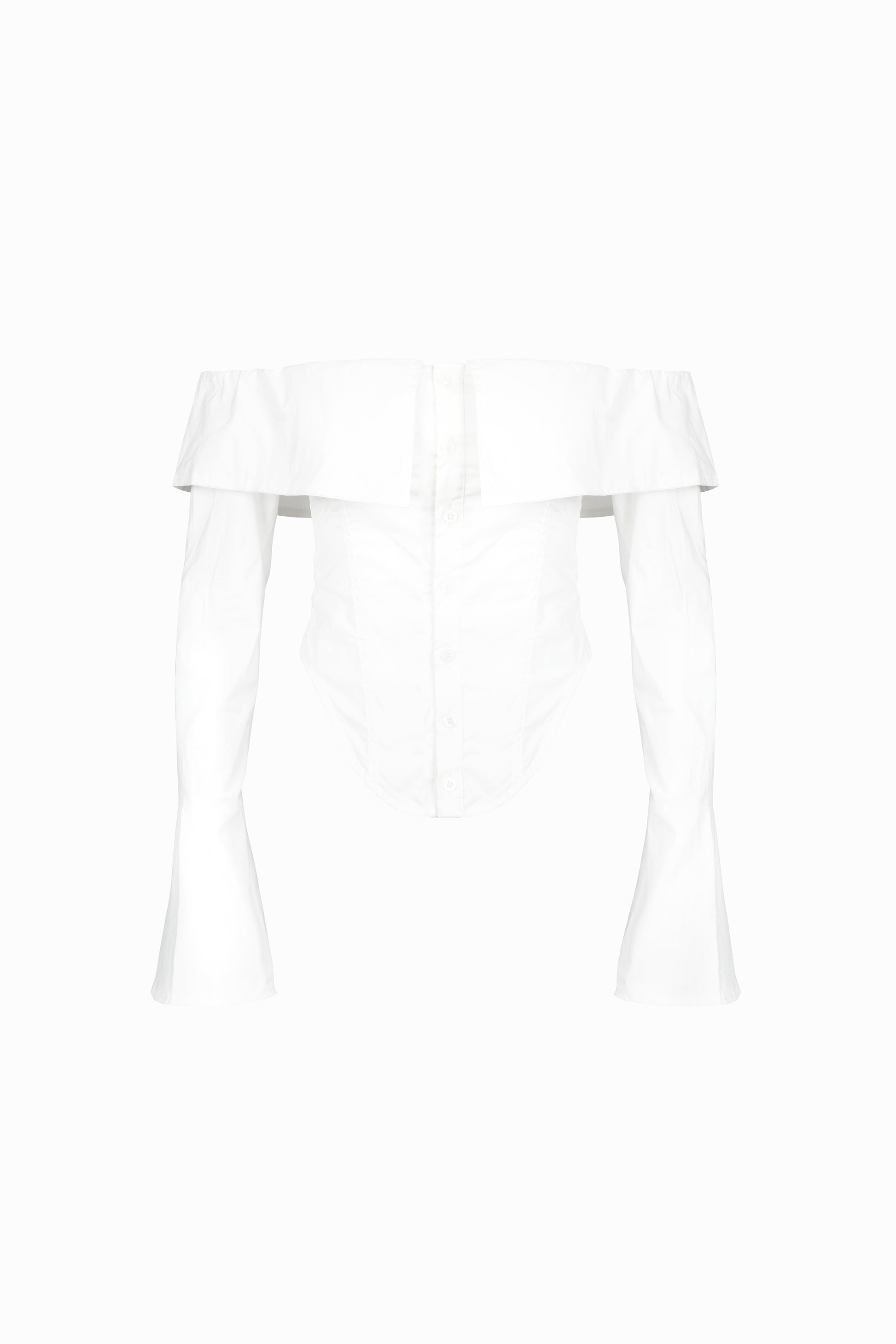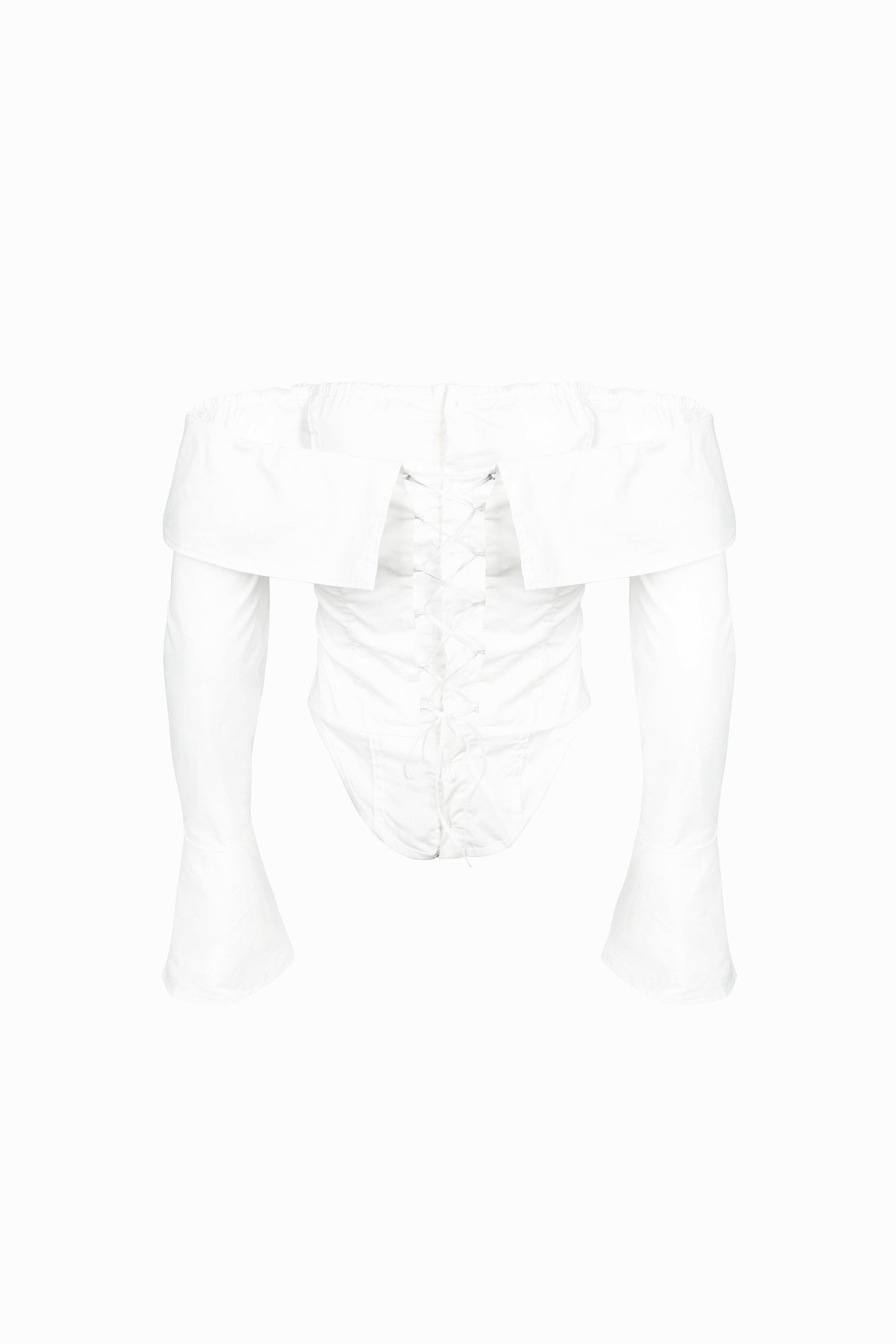 Fitted off-the-shoulder corset shirt. Features a front placket closure and adjustable back lacing. Elastic inserted along the shoulder line for a comfortable fit. All internal seams are neatly finished. Made from 100% cotton.