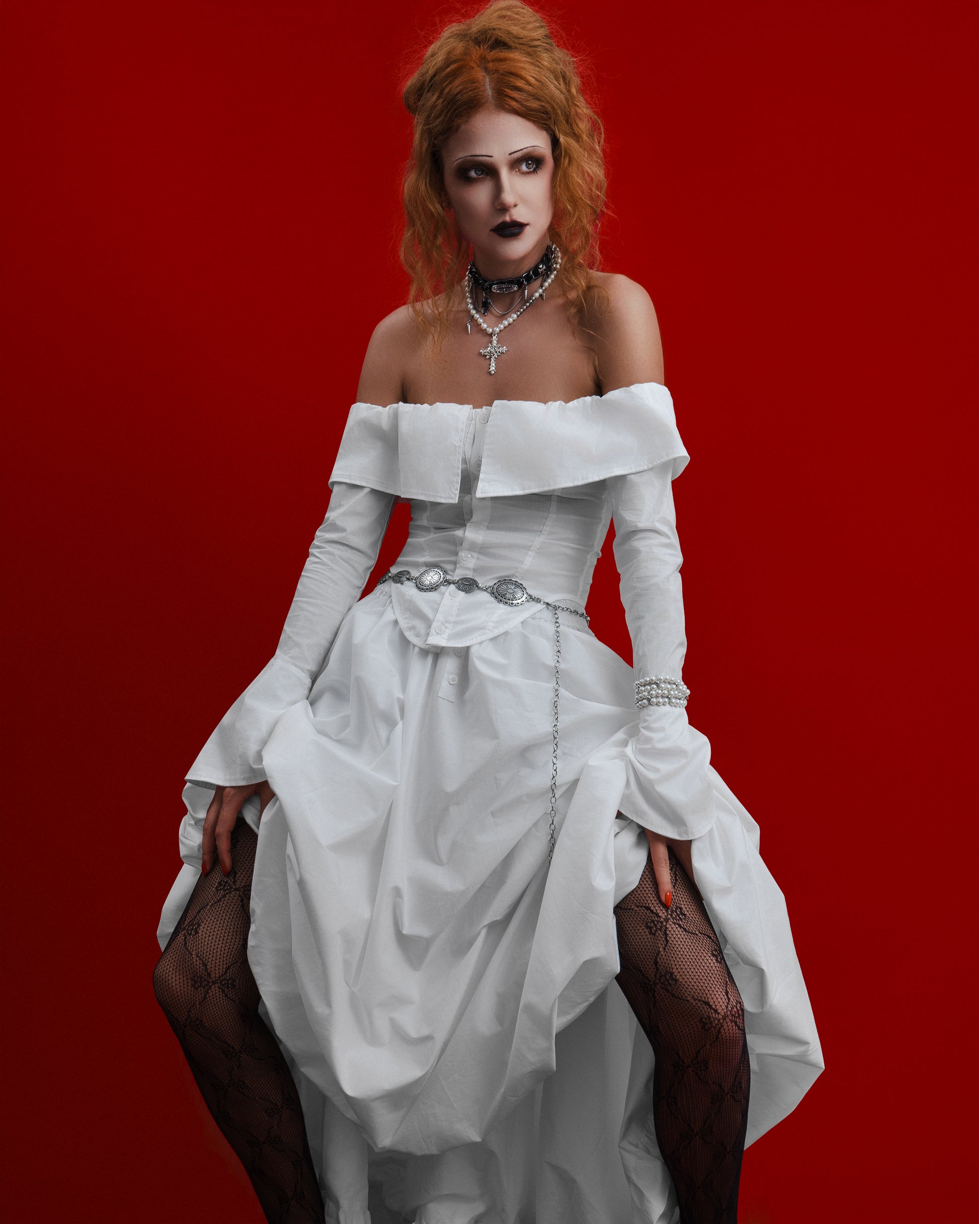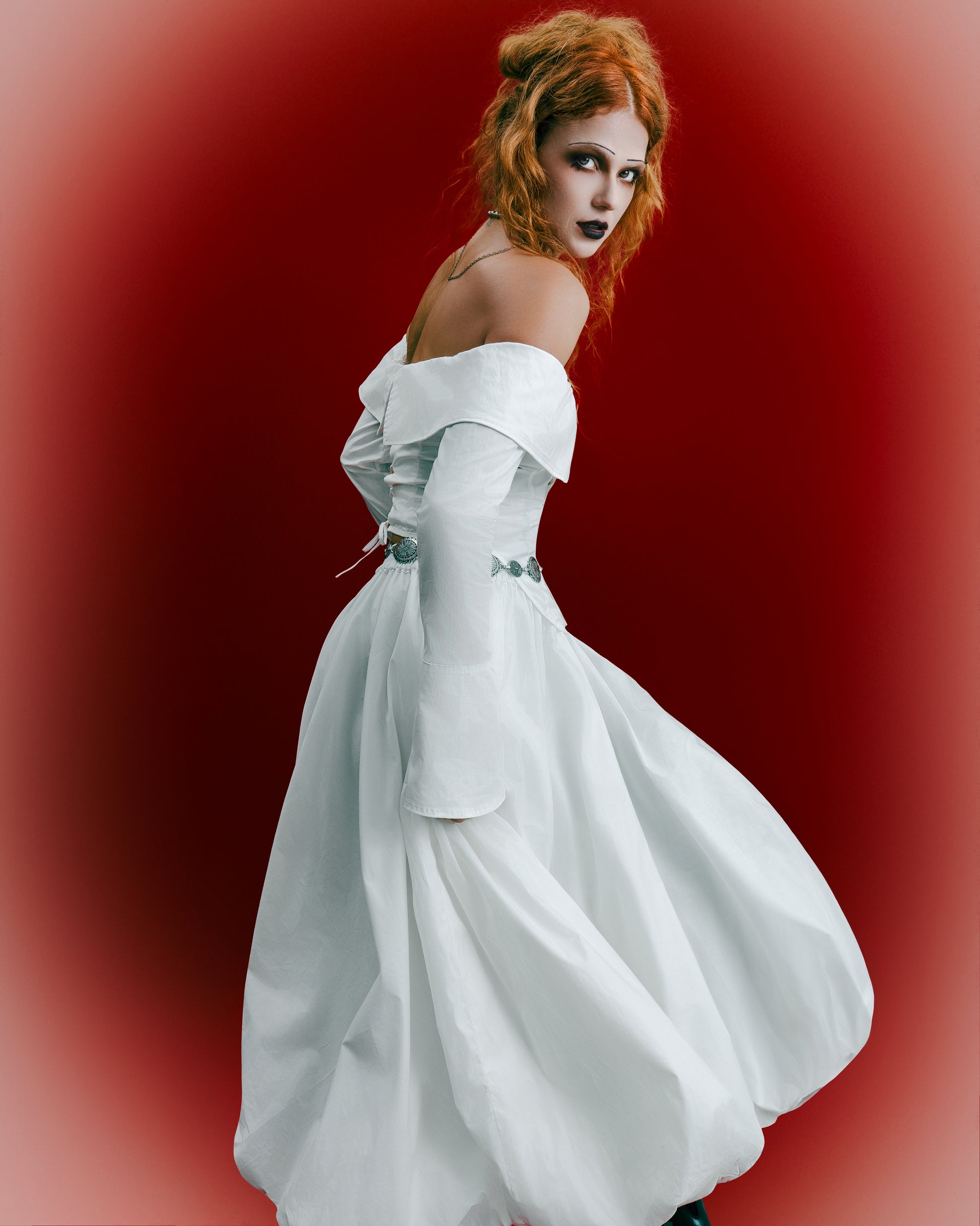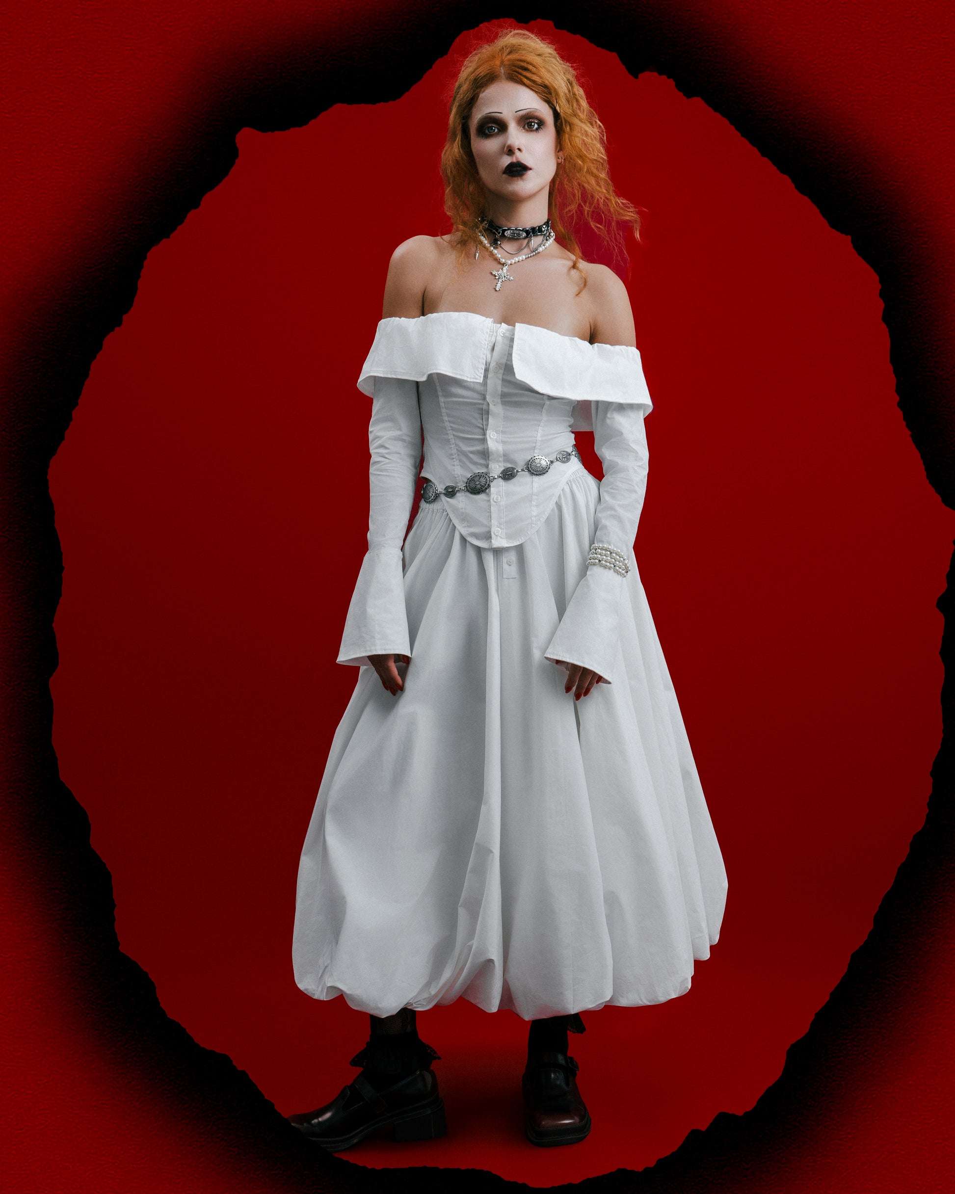 Fitted off-the-shoulder corset shirt. Features a front placket closure and adjustable back lacing. Elastic inserted along the shoulder line for a comfortable fit. All internal seams are neatly finished. Made from 100% cotton.