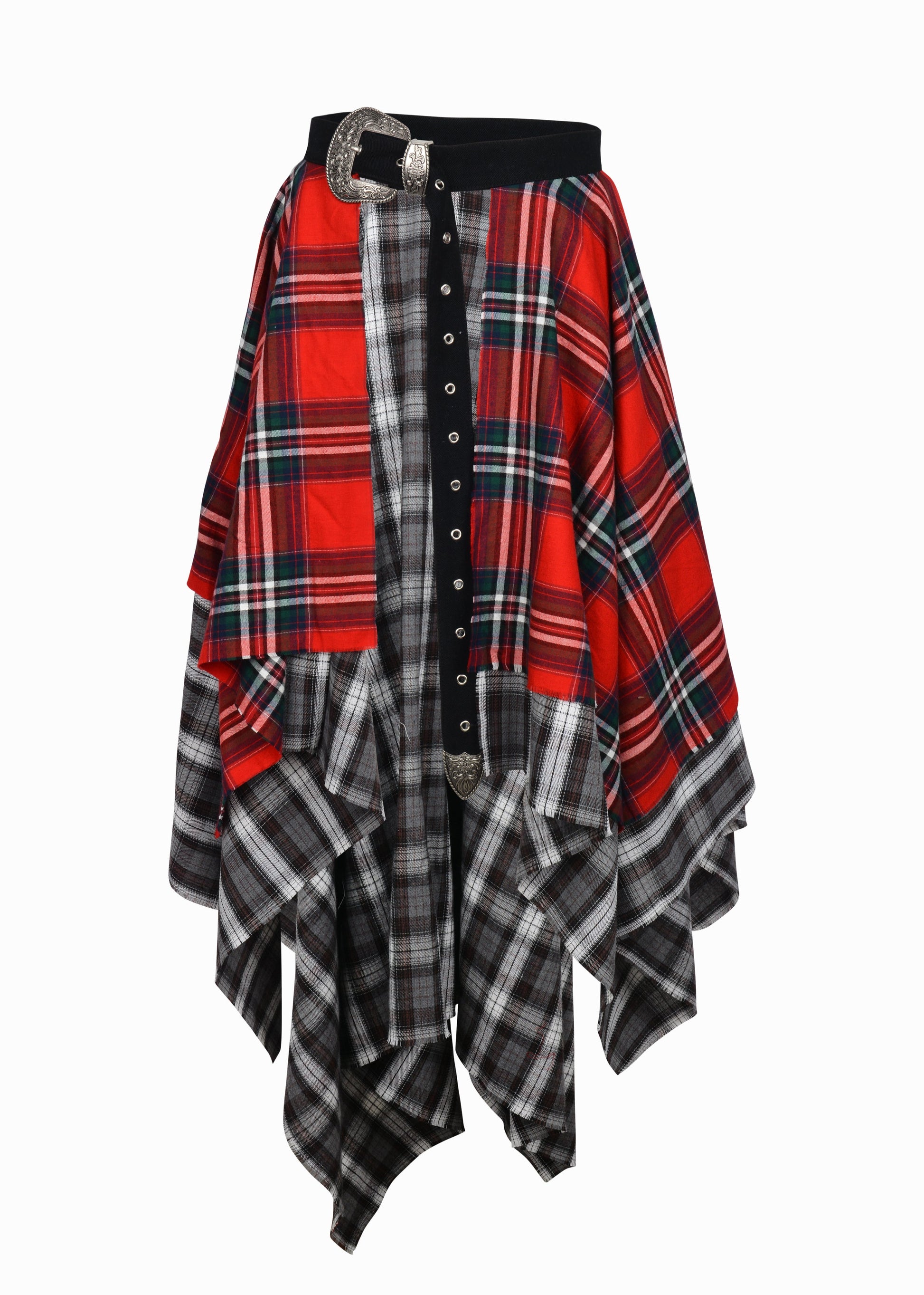 The kilt cape is made of 2 types of cotton check with a belt and a decorative metal buckle. The product fits all sizes.