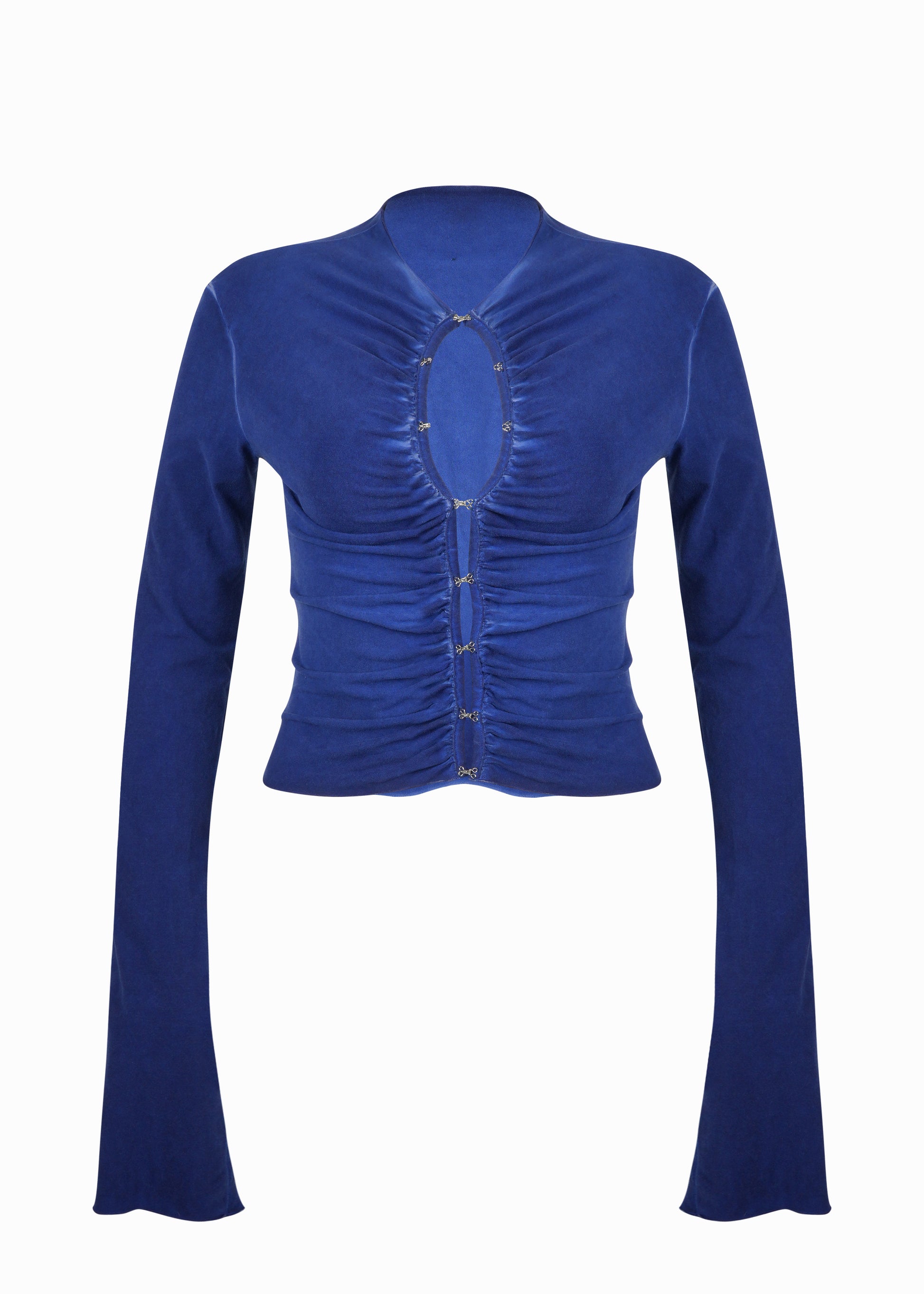 Features a central ruched construction with multiple metal hook fastenings forming an oval cut-out on the chest. Fitted silhouette with structured gathers along the front.