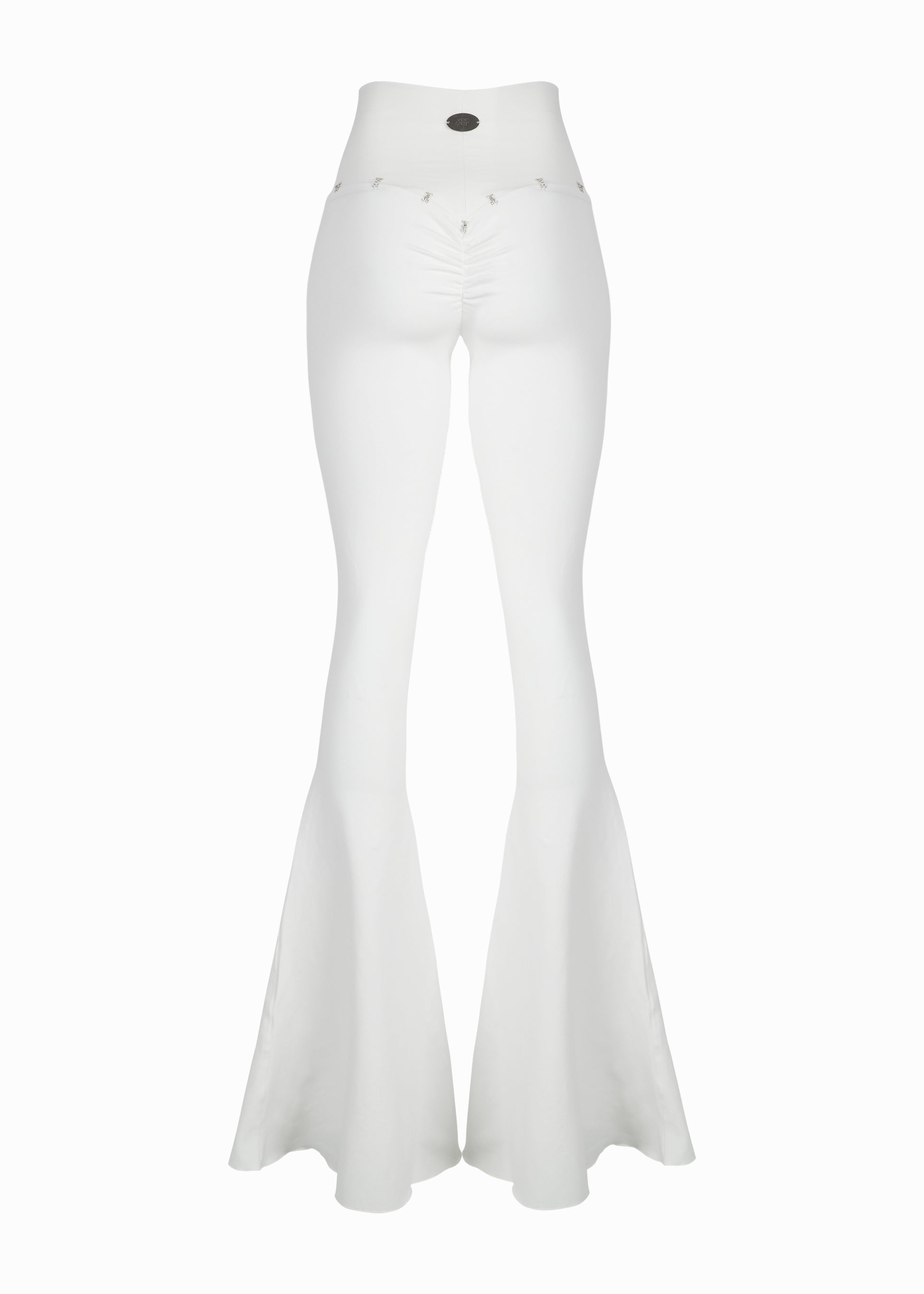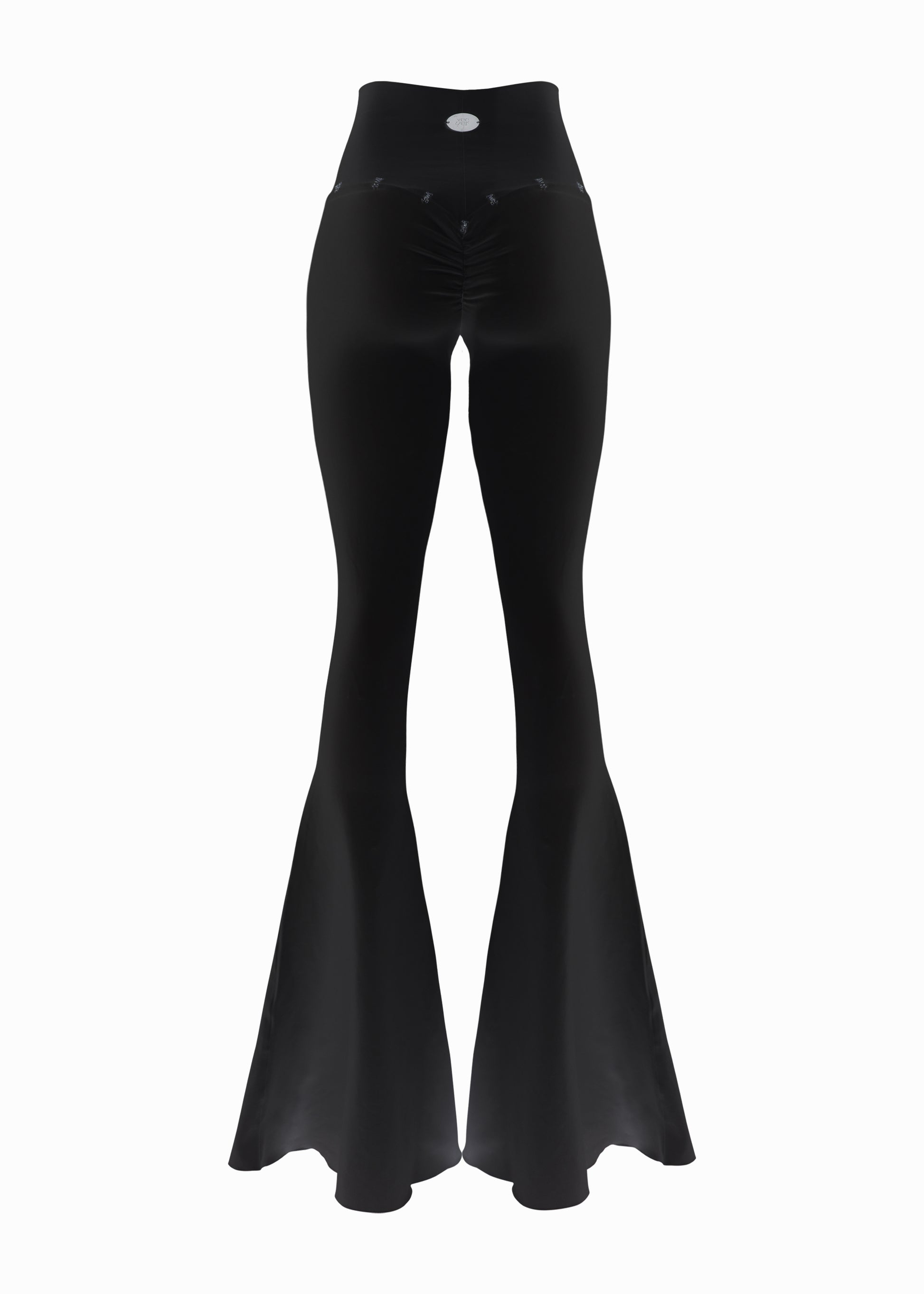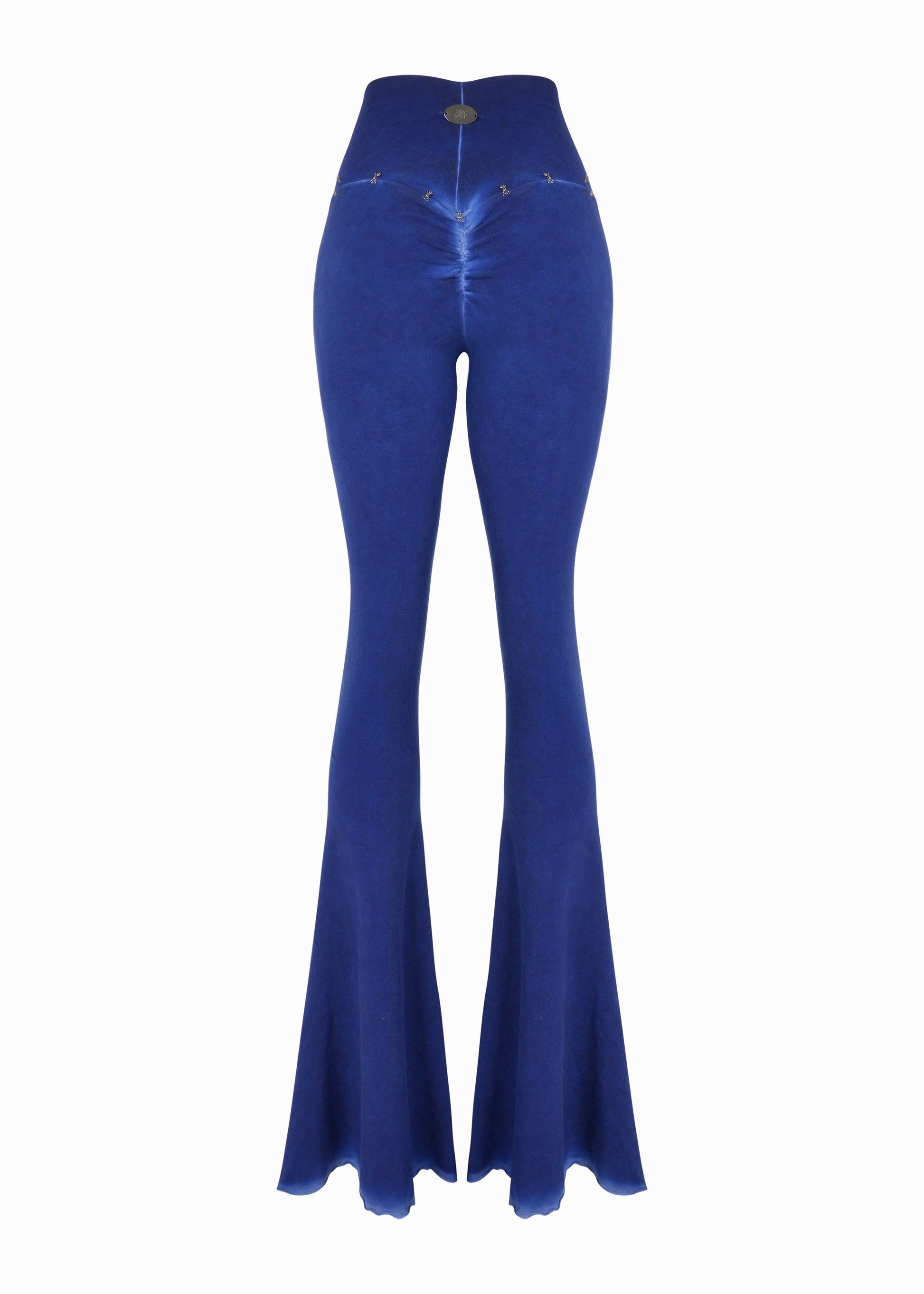 High-waisted flared pants made from dense, elastic 100% viscose jersey with an ice-wash dye technique.