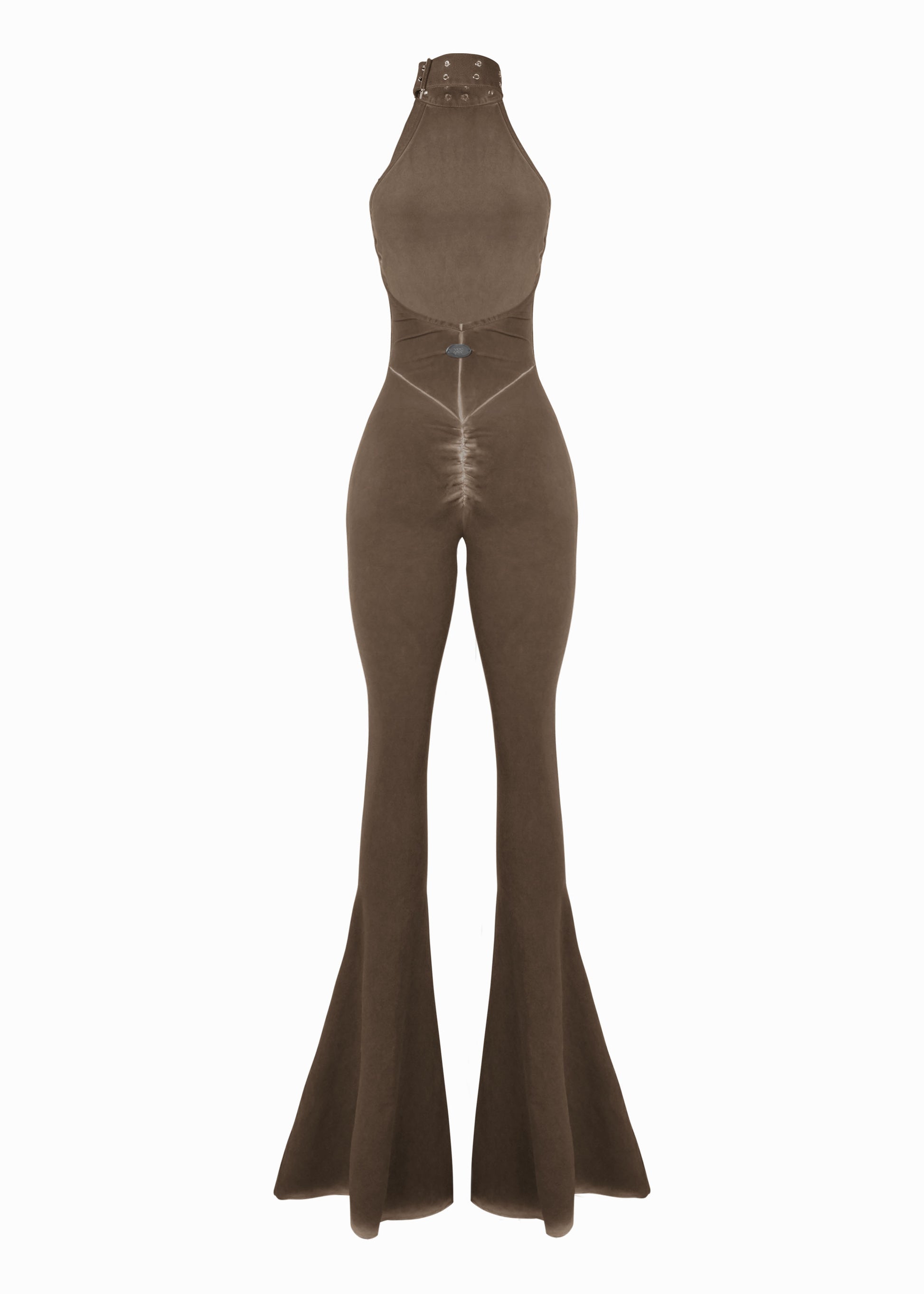 Catsuit made from dense, elastic 100% viscose jersey with an ice-wash dye technique.Features a high denim collar with a buckle and metal eyelets.