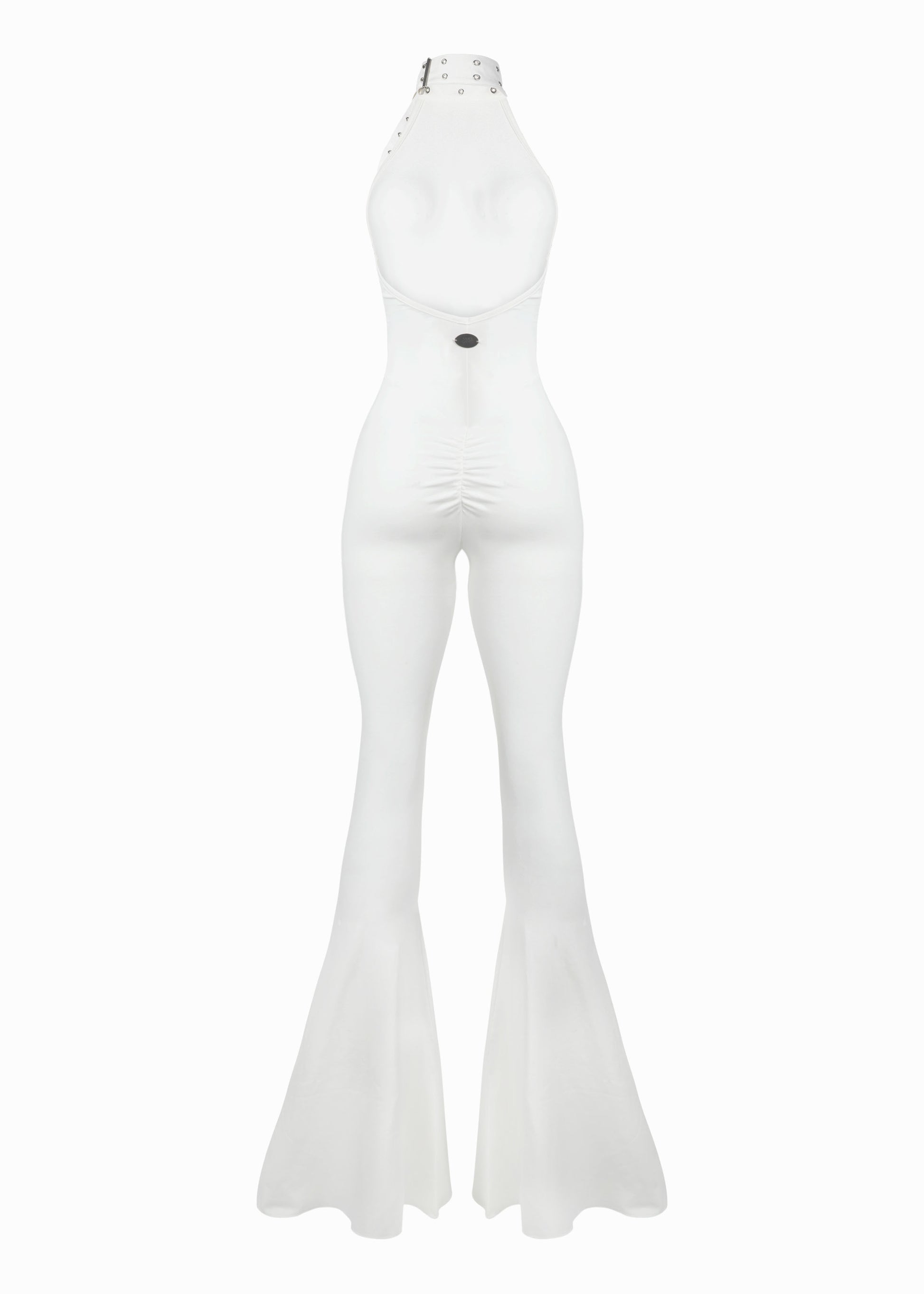 Contrast seams and a waist cinch create a sculpted silhouette, while flared legs visually lengthen the figure.